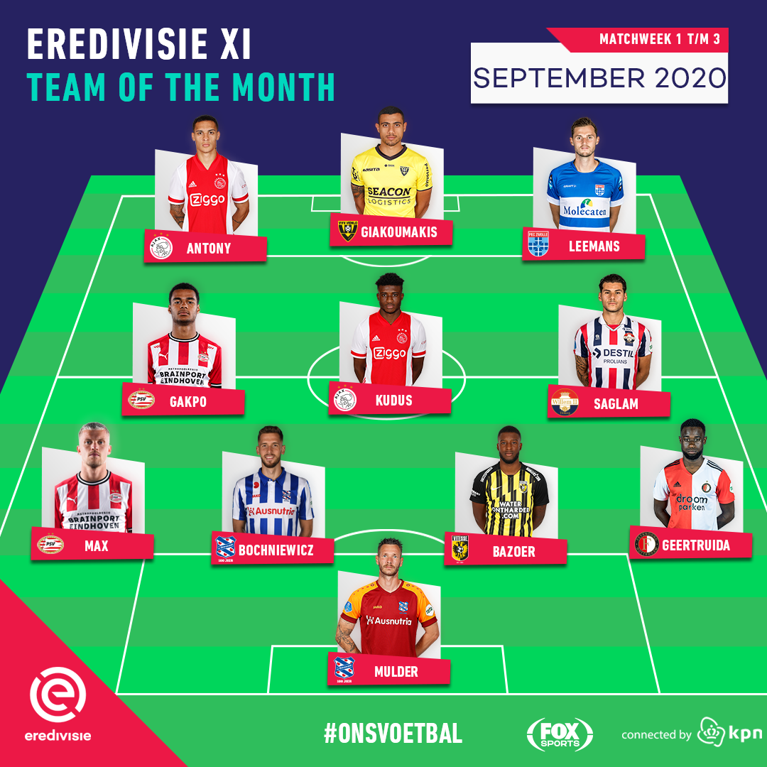 The full Eredivisie Team of the Month: Erwin Mulder (SC Heerenveen), Lutsharel Geertruida (Feyenoord), Riechedly Bazoer (Vitesse), Pawel Bochniewicz (SC Heerenveen), Philipp Max (PSV), Görkem Saglam (Willem II), Mohammed Kudus (Ajax), Cody Gakpo (PSV), Clint Leemans (PEC Zwolle), Giorgos Giakoumakis (VVV-Venlo) and Antony (Ajax).