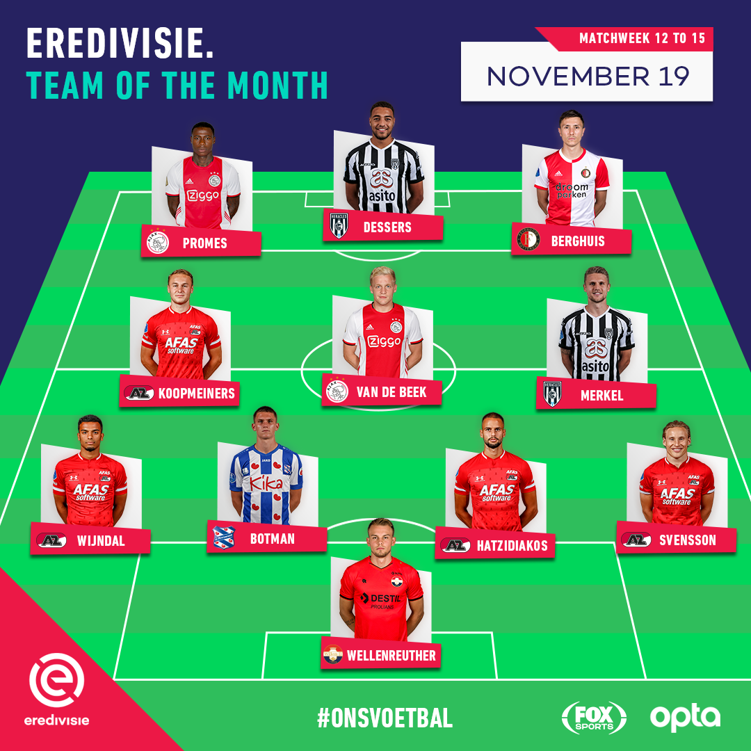 The Eredivisie Team of the Month: Timon Wellenreuther (Willem II), Jonas Svensson (AZ), Pantelis Hatzidiakos (AZ), Sven Botman (sc Heerenveen), Owen Wijndal (AZ), Alexander Merkel (Heracles Almelo), Donny van de Beek (Ajax), Teun Koopmeiners (AZ), Steven Berghuis (Feyenoord), Cyriel Dessers (Heracles Almelo) and Quincy Promes (Ajax).
