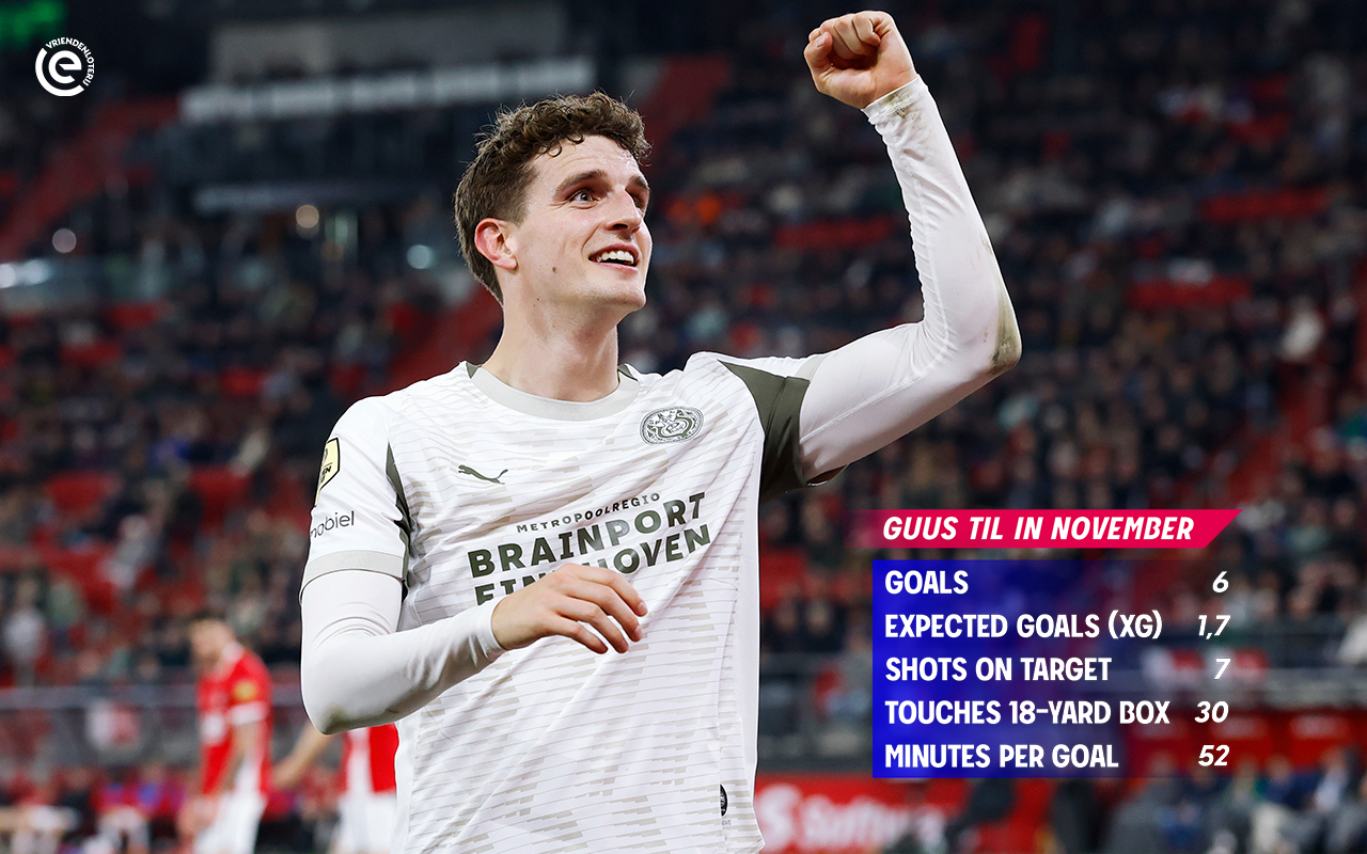 Guus Til has been named Eredivisie Player of the Month for November. The PSV forward stood out based on Opta statistics.