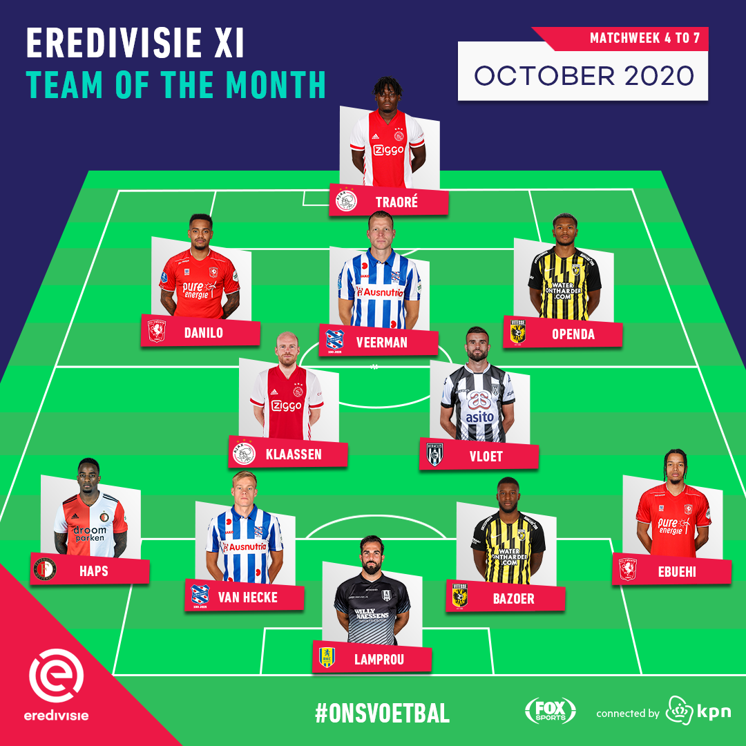 The full Eredivisie Team of the Month: Kostas Lamprou (RKC Waalwijk), Tyronne Ebuehi (FC Twente), Riechedly Bazoer (Vitesse Arnhem), Jan Paul van Hecke (sc Heerenveen), Ridgeciano Haps (Feyenoord Rotterdam), Rai Vloet (Heracles Almelo), Davy Klaassen (AFC Ajax), Loïs Openda (Vitesse Arnhem), Henk Veerman (sc Heerenveen), Danilo (FC Twente) and Lassina Traoré (AFC Ajax).