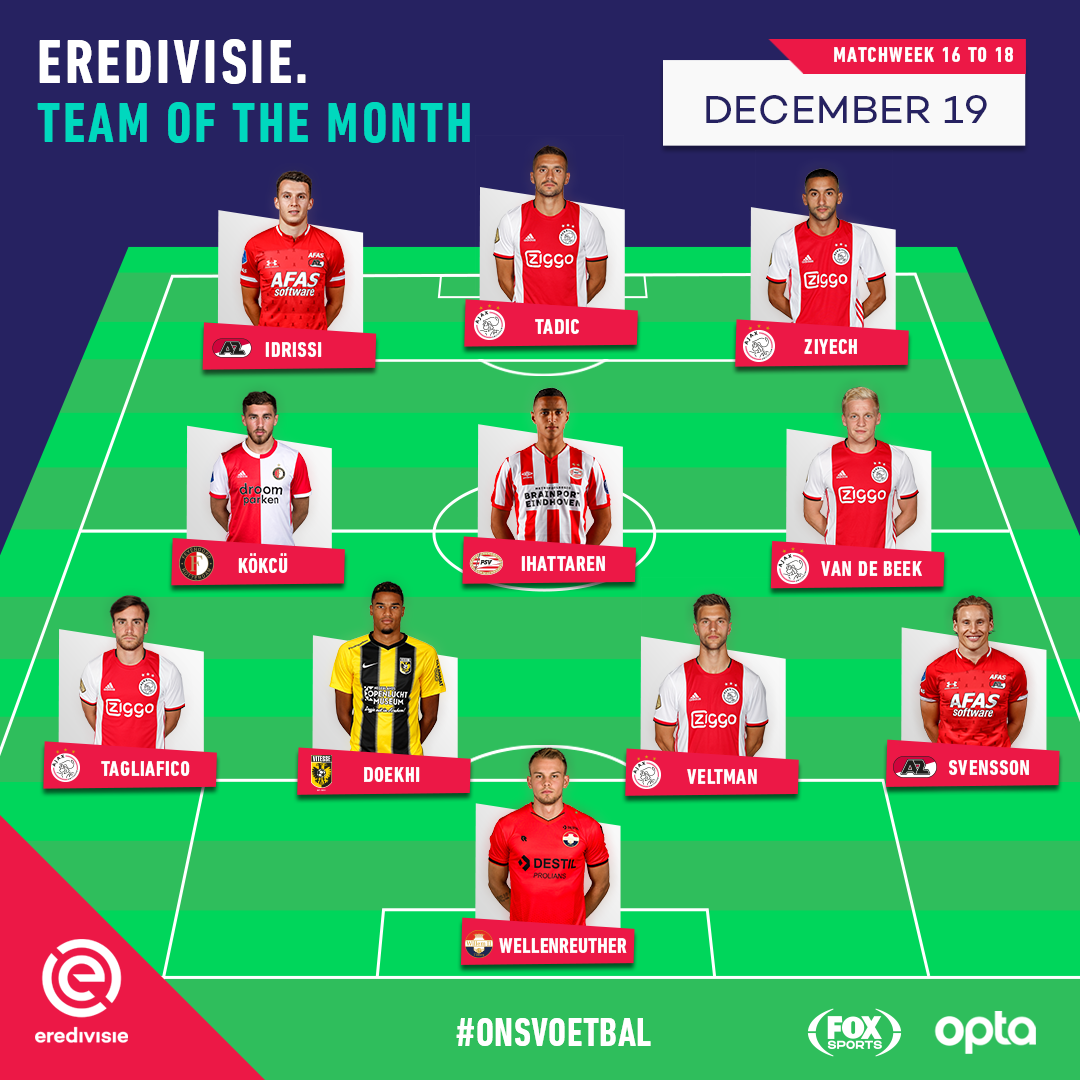With five players, Ajax is the main provider of players for the Eredivisie Team of the Month. Hakim Ziyech and Nicolás Tagliafico achieved the highest scores among Ajax players, while Dusan Tadic, Donny van de Beek and Joël Veltman also gained a place in the team. AZ were second, with two players: Oussama Idrissi and Jonas Svensson.