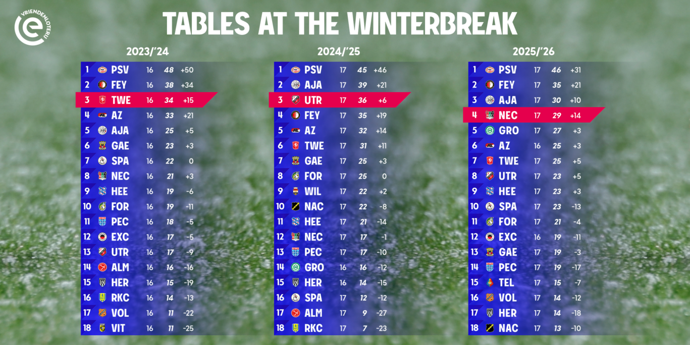 After seventeen matchweeks, the picture for now is taking shape. PSV are winter champions for the third consecutive year, while N.E.C. Nijmegen and FC Groningen finish the calendar year impressively inside the top five. On the final matchday of the first half of the season, Telstar passed on the red lantern to NAC Breda.