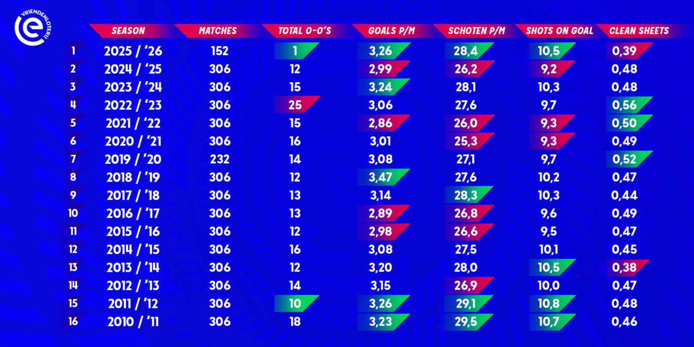 As a result, the record for the fewest 0–0 draws in a single season is now within reach. In 1962/63, just eight of the 240 matches finished goalless. Despite the higher number of fixtures in the current competition format (306 matches), a new record remains a realistic possibility.