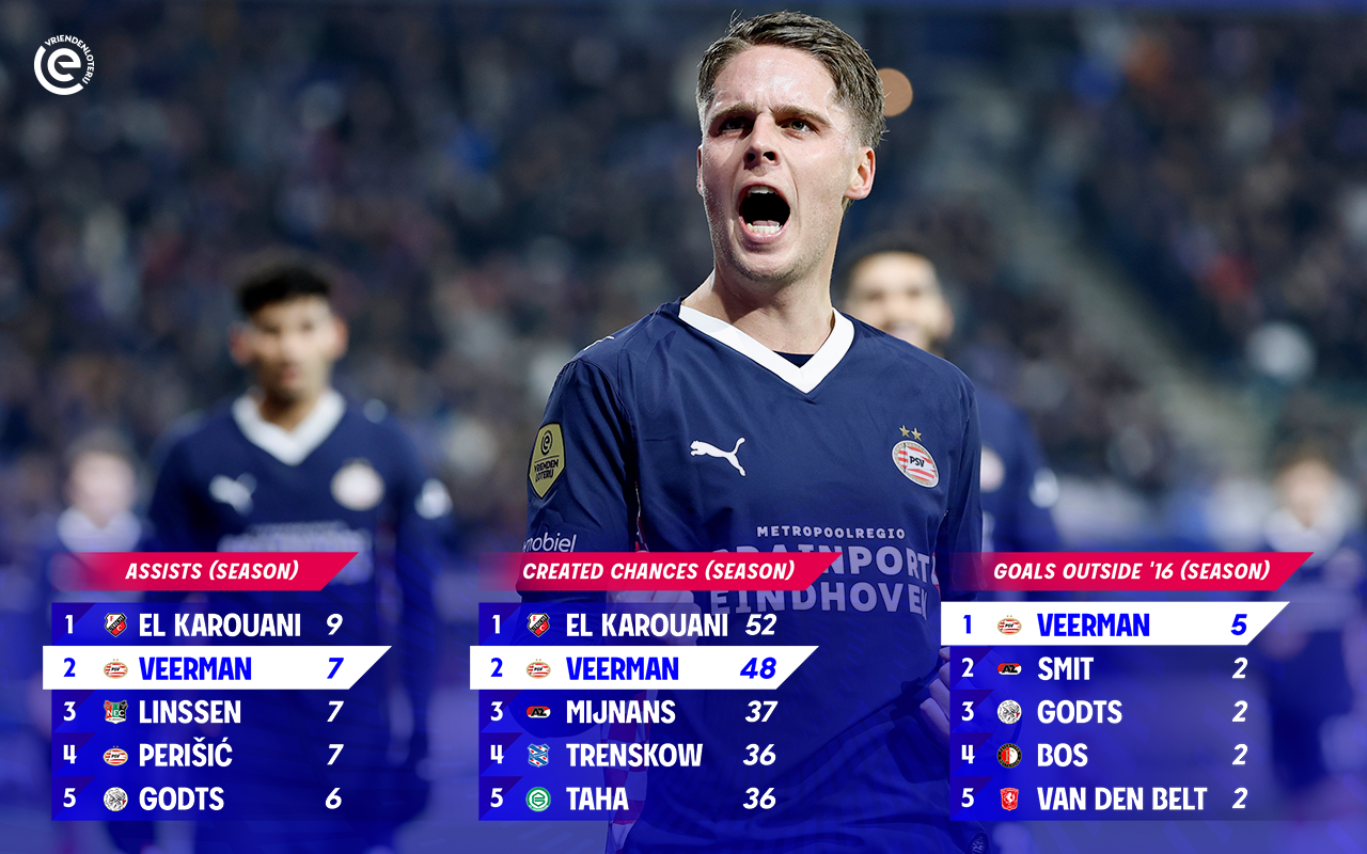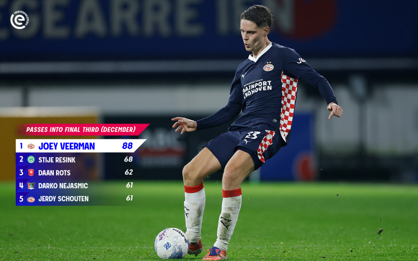 In total, Veerman took four shots, two of which resulted in goals. He also created ten chances during December, committed just two fouls and won two of his three attempted tackles. In addition, he recorded more passes into the attacking third than any other player (88), underlining his influence on PSV’s play.